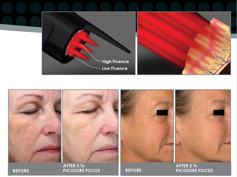 Picosure được sử dụng để cung cấp các xung năng lượng chuyên biệt cực ngắn tới các hạt mực xăm/sắc tố; các hạt mực xăm/sắc tố sau đó bị vỡ thành các hạt nhỏ giống như bụi. Những hạt nhỏ này sau đó sẽ được hấp thụ bởi hệ thống bạch huyết và loại bỏ một cách tự nhiên, làm loại bỏ hình xăm hoặc các vấn đề sắc tố của bạn. Giúp bạn trông trẻ trung hơn với làn da hồi sinh, liệu pháp này cũng khai thác khả năng chữa lành tích hợp của cơ thể bạn: Khi các tế bào da của bạn bị các xung cực ngắn tác động, “tín hiệu tế bào” xảy ra, thúc đẩy cơ thể giải phóng protein. Sau đó, các protein được giải phóng này sẽ tạo ra phản ứng chữa lành, dẫn đến cải thiện sản xuất collagen và elastin để có vẻ ngoài tươi tắn, sáng sủa và trẻ trung hơn.