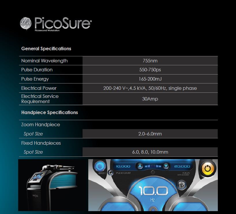 PicoSure dùng để xóa hình xăm và các tổn thương sắc tố lành tính (ví dụ: tàn nhang dạng sắc tố, đốm nắng và sự đổi màu); Nó cũng điều trị sẹo mụn trứng cá, nếp nhăn và cung cấp sự hồi sinh toàn diện cho làn da.